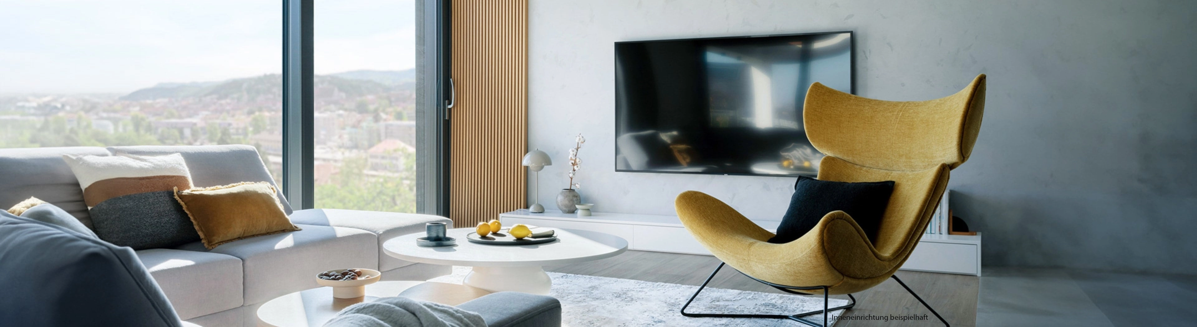 Große Fensterfronten lassen Licht und Luft in das Ambiente und bieten einen wunderbaren Blick über die Stadt. Die großzügigen Balkone, Logien und Terrassen bieten Raum für Entspannung im Freien und schaffen eine Verbindung zur umliegenden Natur. Diese Verbindung findet sich auch in der Bauweise wieder. Der qualitativ hochwertige Holzbau ist nicht nur umweltfreundlich, sondern garantiert auch einen warmen und einladenden Charakter.